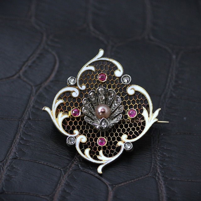布を挟んで固定するクリップ式の留め金で、ドレスの胸元を艶やかに飾るこのブローチ。洋服のアウトラインに固定されると、服とジュエリーの独特な一体感が作り出され、エレガントな印象が増す。力強くもあり、洗練さも際立つ優れたジュエリーです。