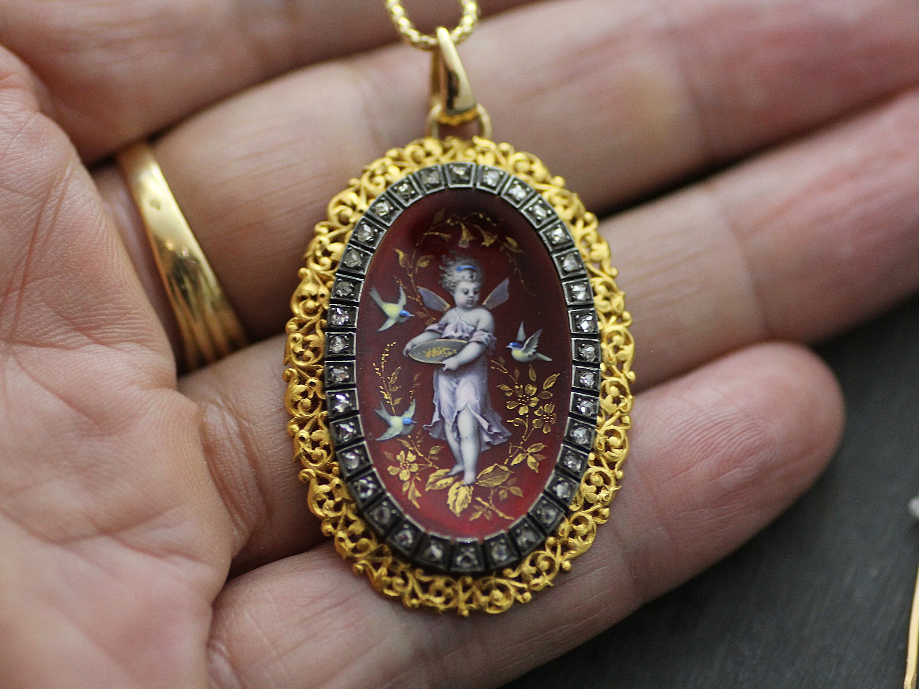 エナメル画に見事なゴールドのフレームが着けられ、まるで身に着ける絵画のようです。