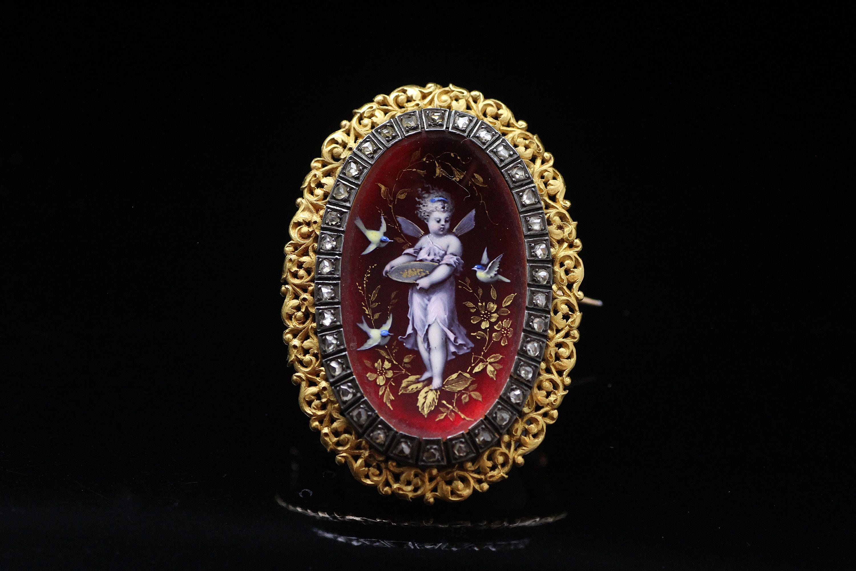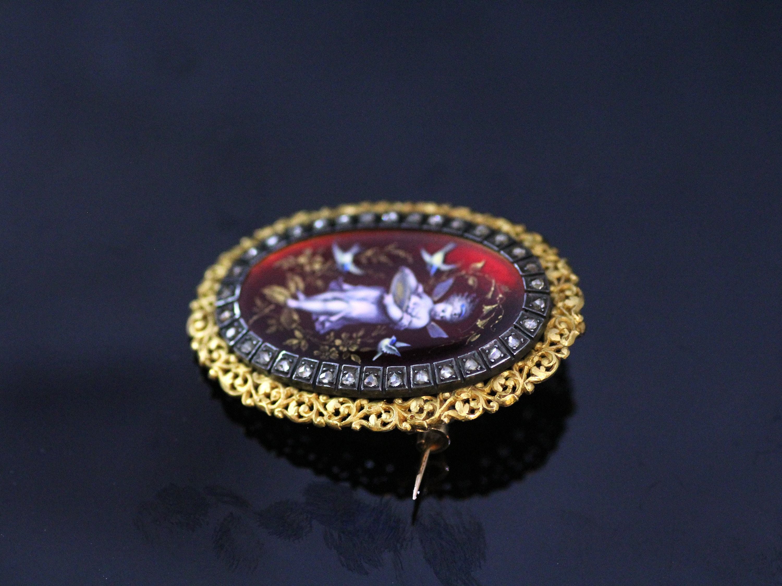 この作品は、ゴールドとローズカットダイヤモンドに囲まれたリモージュエナメルのブローチです。えんじ色の輝くエナメルの上に、金色の数種類の花に囲まれたプシケと三羽の小鳥が描かれています。ベースのえんじ色のエナメル部分は、中央をへこませた湾曲の銅版が使われています。銅はエナメル加工がしやすい金属で、ゴールドよりも耐久性に優れているといわれています。
