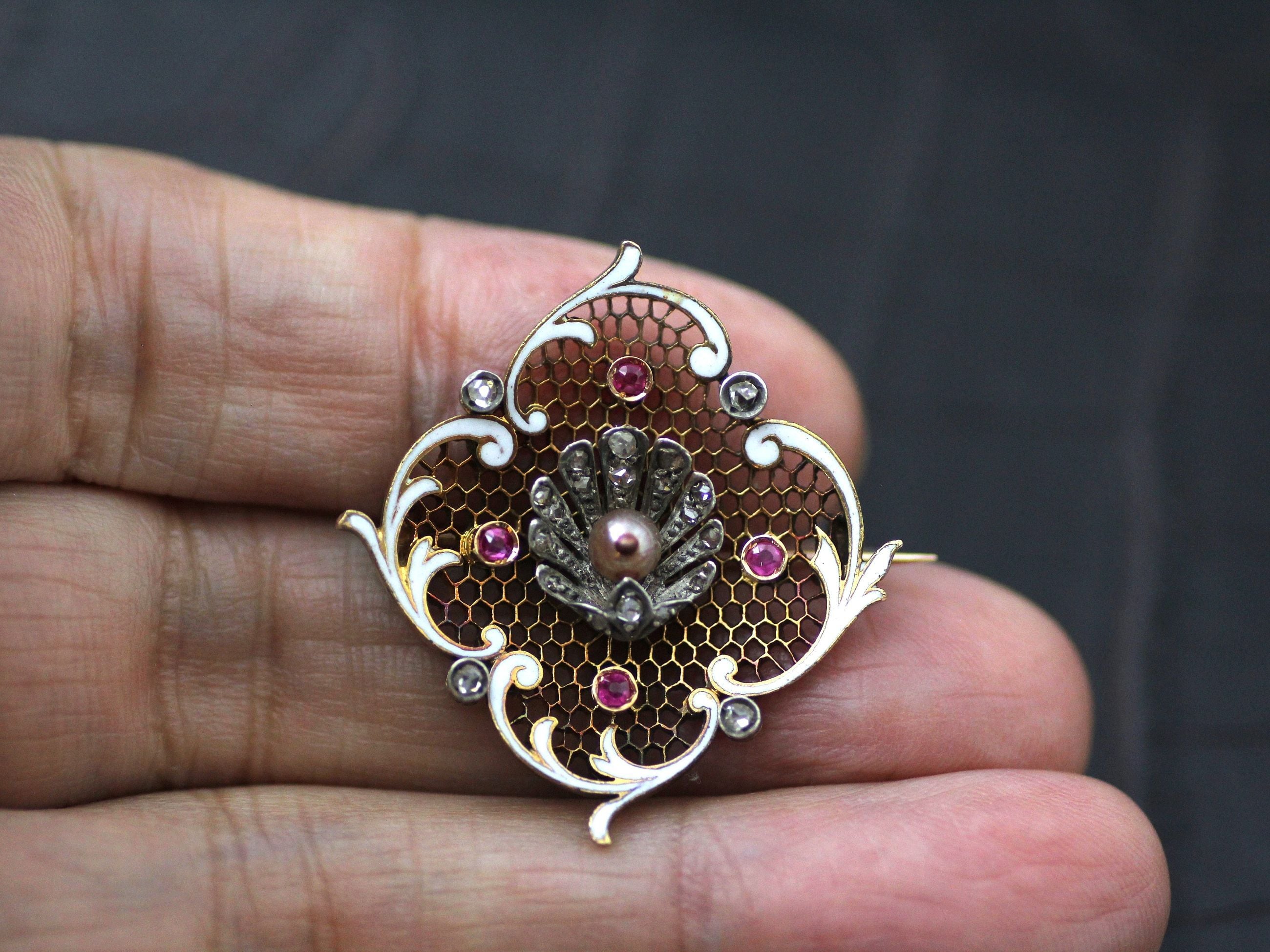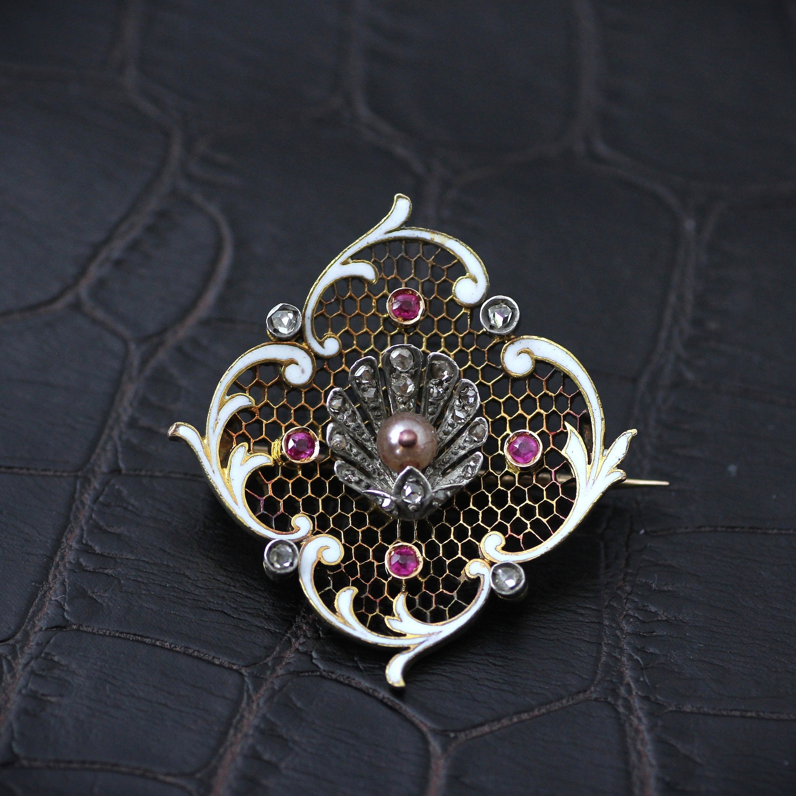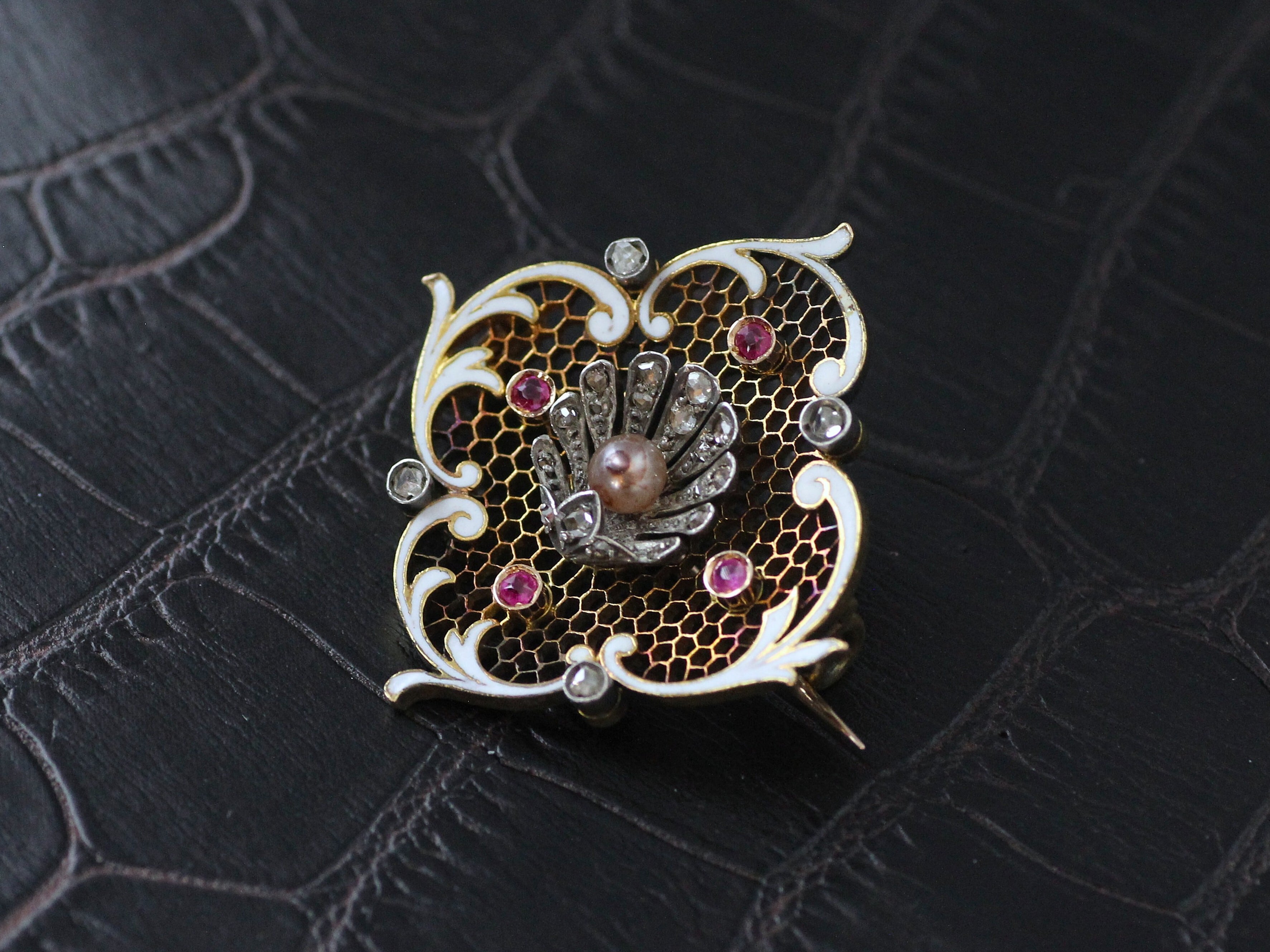 このブローチのデザイン要素は、18世紀に流行したRococo ロココの様式から発想を得たものです。白いエナメルで飾られたアーカンサスの葉、グレーのパールを中心に置いたダイヤモンドが敷き詰められたロカイユ、ブローチのベースに広がるゴールドのハニカムなど、何と華やかで魅力的なブローチでしょう!