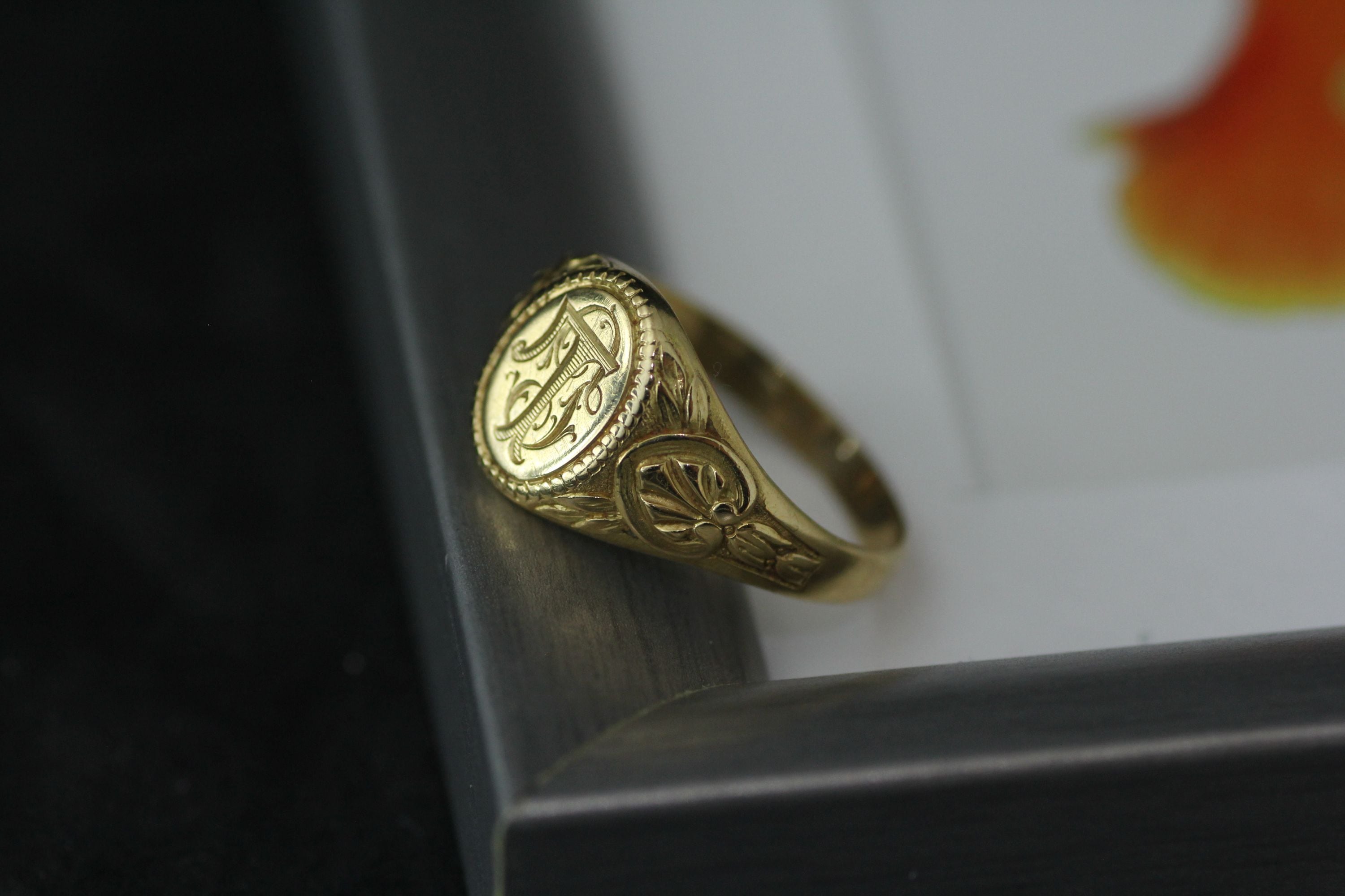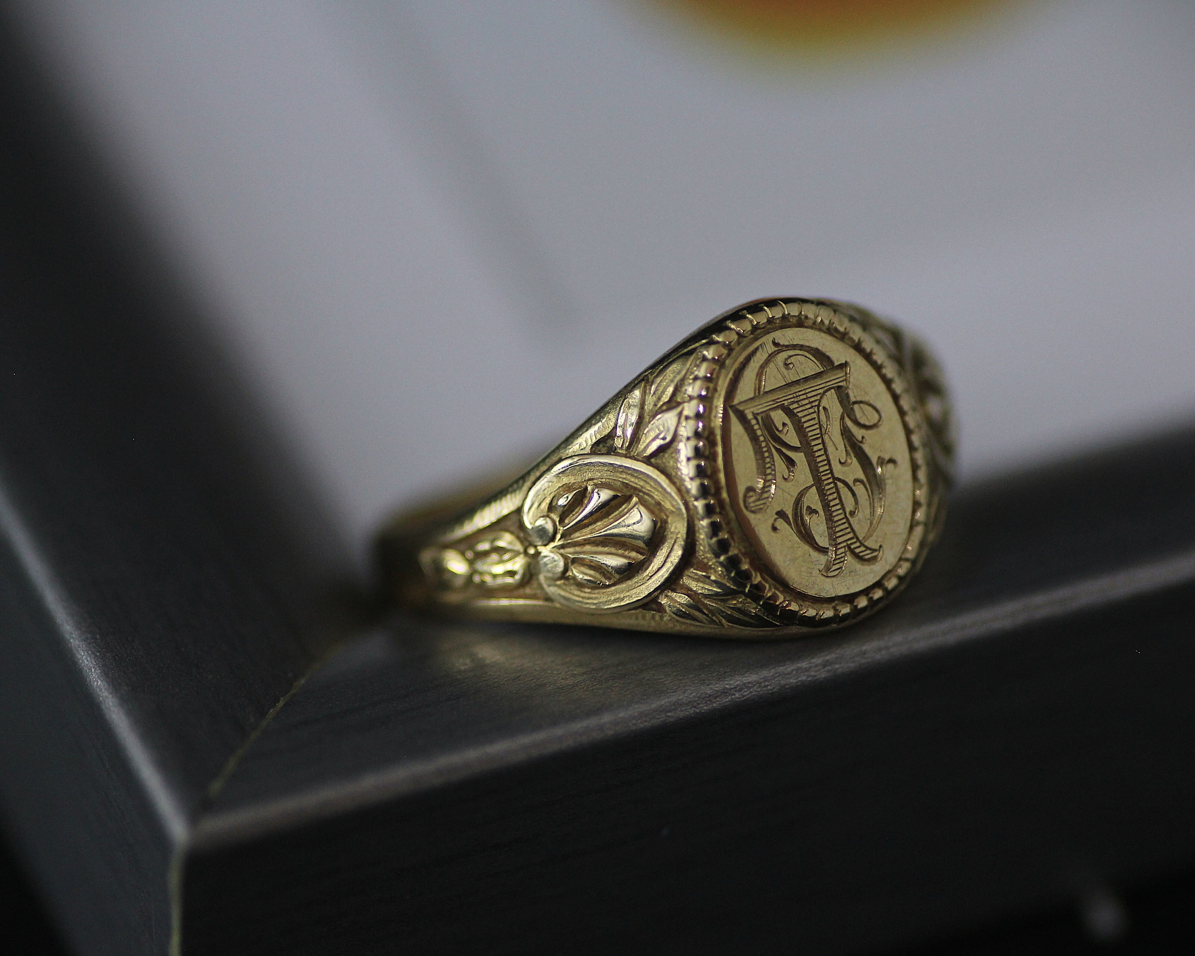 トップ表面の楕円部分に 大文字のTと小文字のg を思わせるイニシャルモノグラム(逆さ文字ではない)が刻まれています。古いリングに刻まれたこの様なモノグラムは、デザインの発想力の豊かさと洗練されたラインの素晴らしさにいつも感動してしまいます。