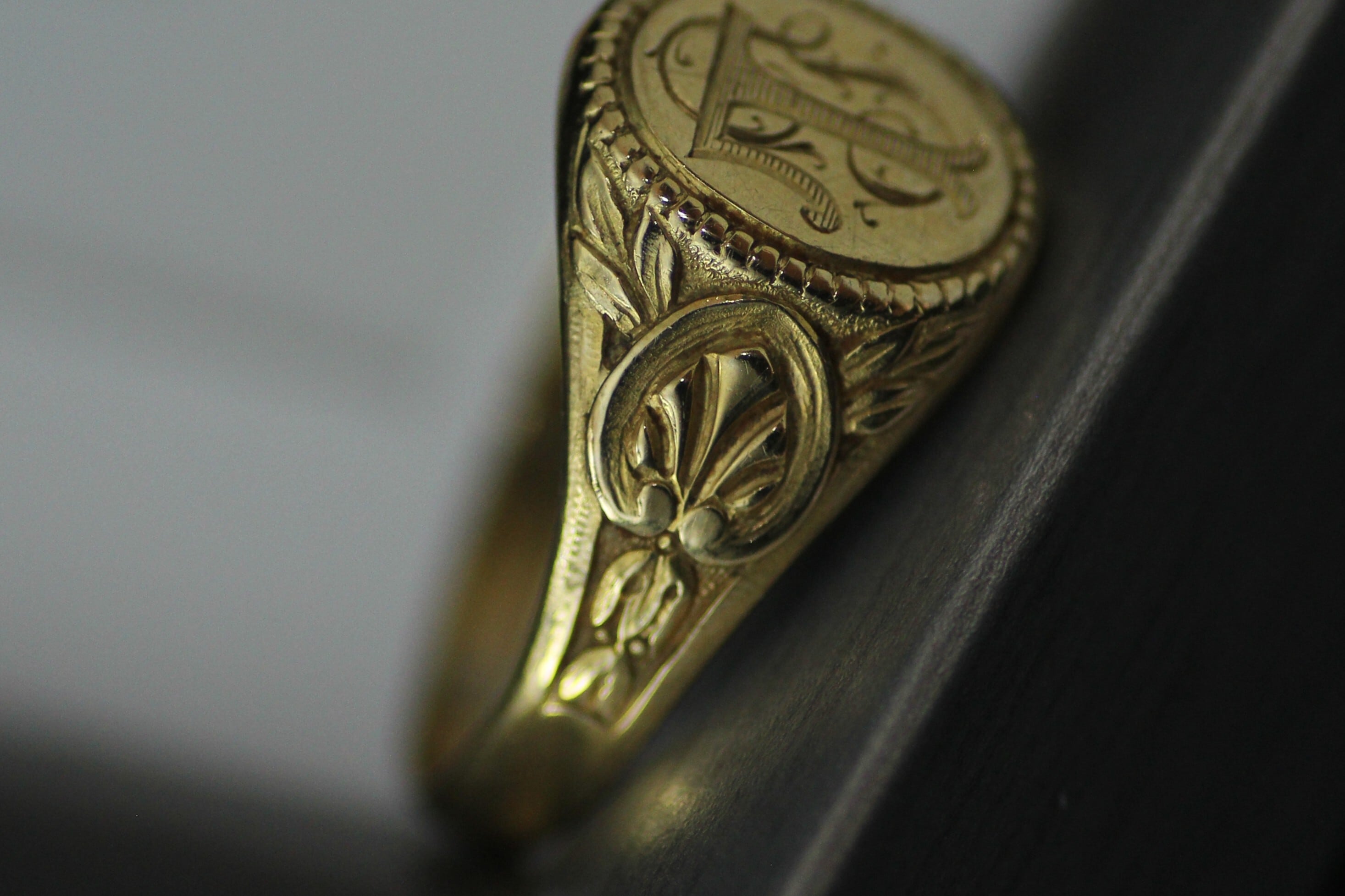 この時代のフランスで流行した青味を感じさせるゴールドに、19世紀の装飾デザインが全体を覆い、リングの存在感を強く感じさせます。