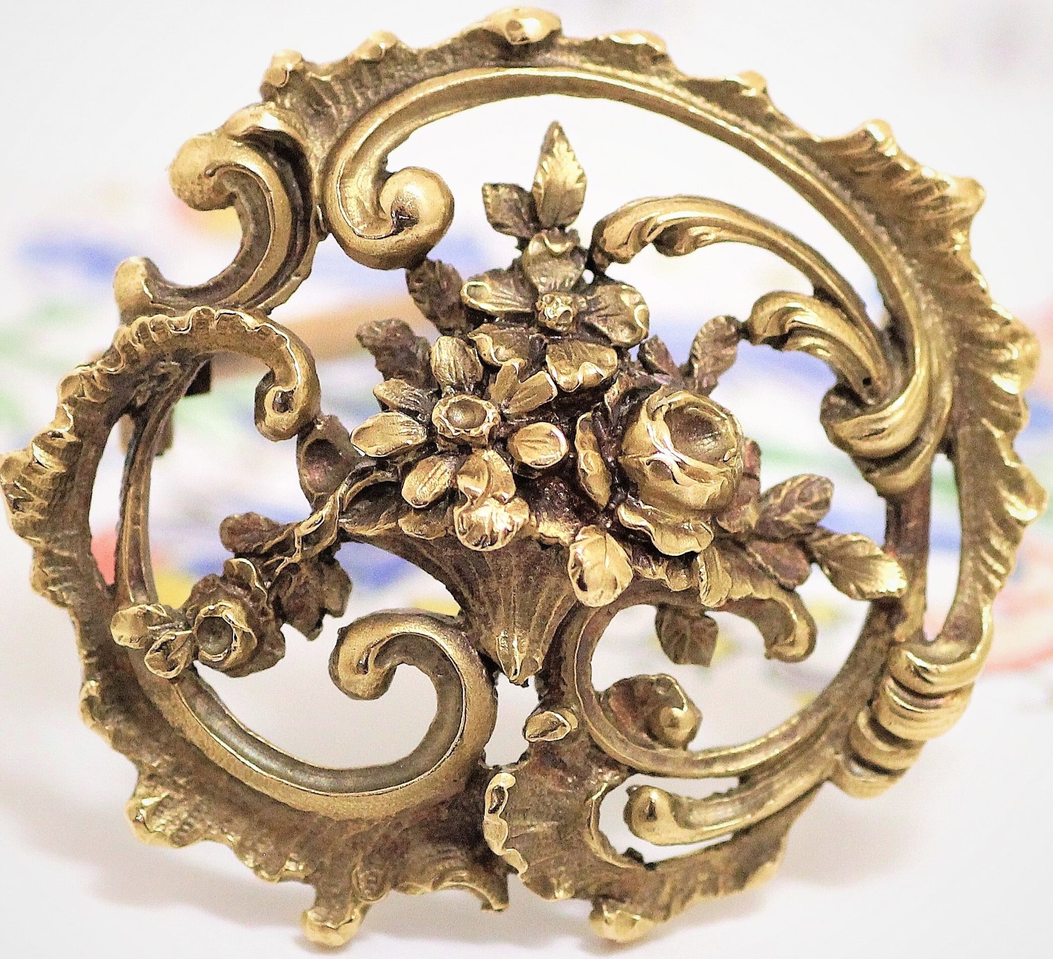 アーカンサスの葉模様と、C and S-scrolls スクロールの縁取りがされたアシメントリーフレームは、ロココデザインの基本的な装飾で、その中に花籠が置かれた愛らしいブローチ。