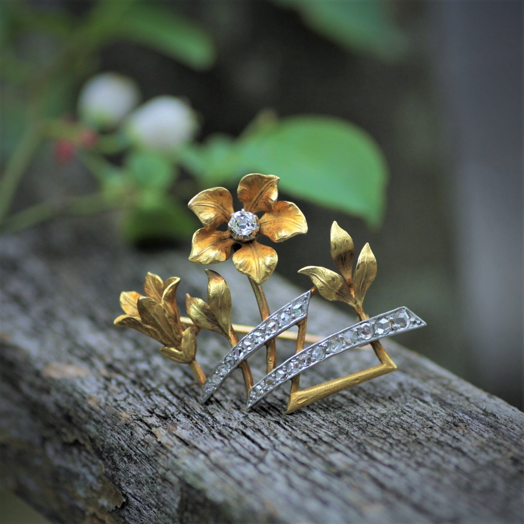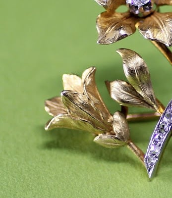 花弁や葉の個々の金細工は、この時代のフランスの典型的な表現スタイルで、表面のディテールが細かく描かれています。柔らかな立体表現は現代のジュエリーの追随を許しません。