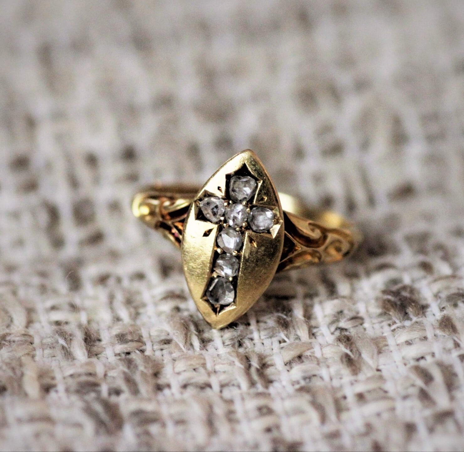 直径1.0cmのマーキース型のゴールドの表面に、ローズカットダイヤモンドのクロスが装飾されたリング。ゴールドの表面がマットに仕上げられいい雰囲気を醸しています。