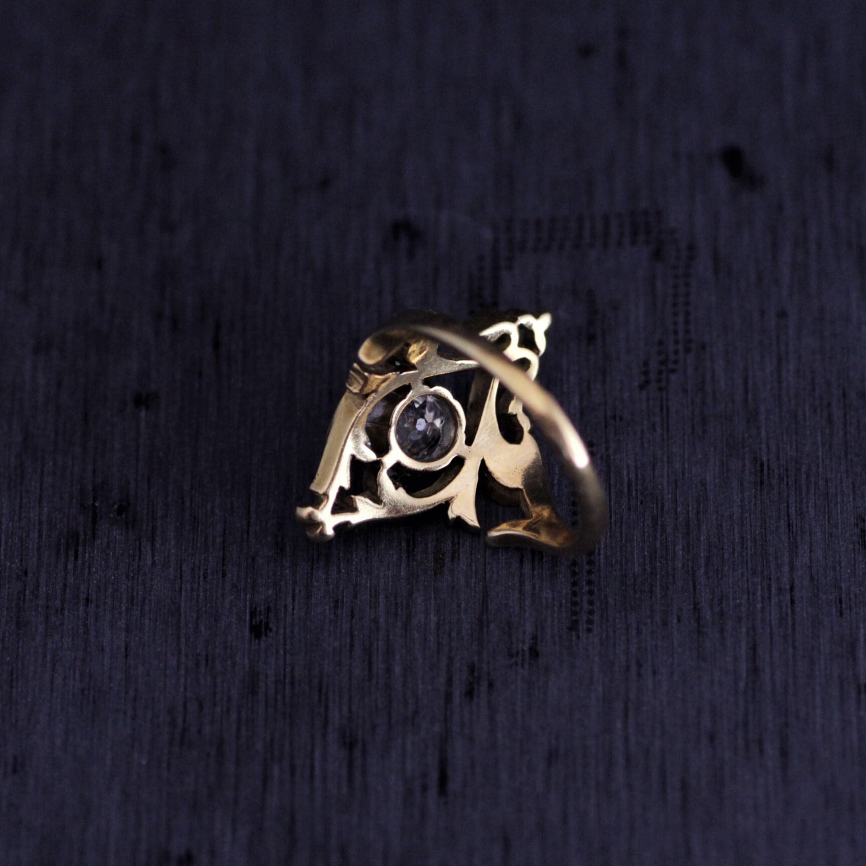 このリングの魅力の一つは、このコロンとしたオールドカットのダイヤモンド。キューレットの面がある厚みのあるカットは、アンティークジュエリーを好きな人にとってはたまらない、愛おしいカットです。良質で白く輝き、目だったインクルージョンは見当たりません。約0.75~0.8カラット余りありますから迫力も感じさせます。